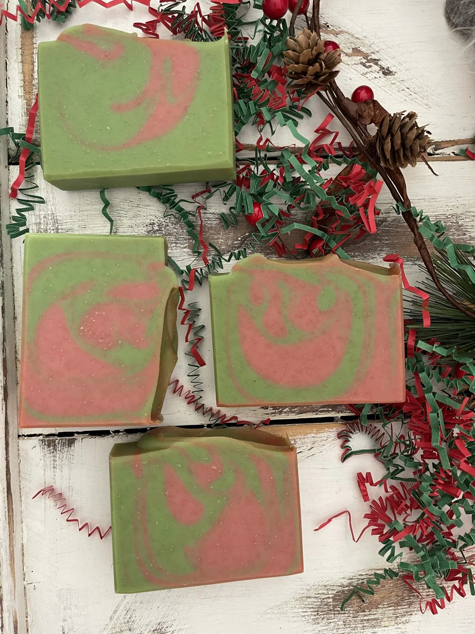 Saponified Olive oil, Coconut oil, Shea butter, Avocado oil, Castor oil, Distilled water, Sodium hydroxide (lye), Lingonberry Spice fragrance oil, Sodium lactate, Sugar, White kaolin clay, Jade Green mica, and Candy apple red mica.