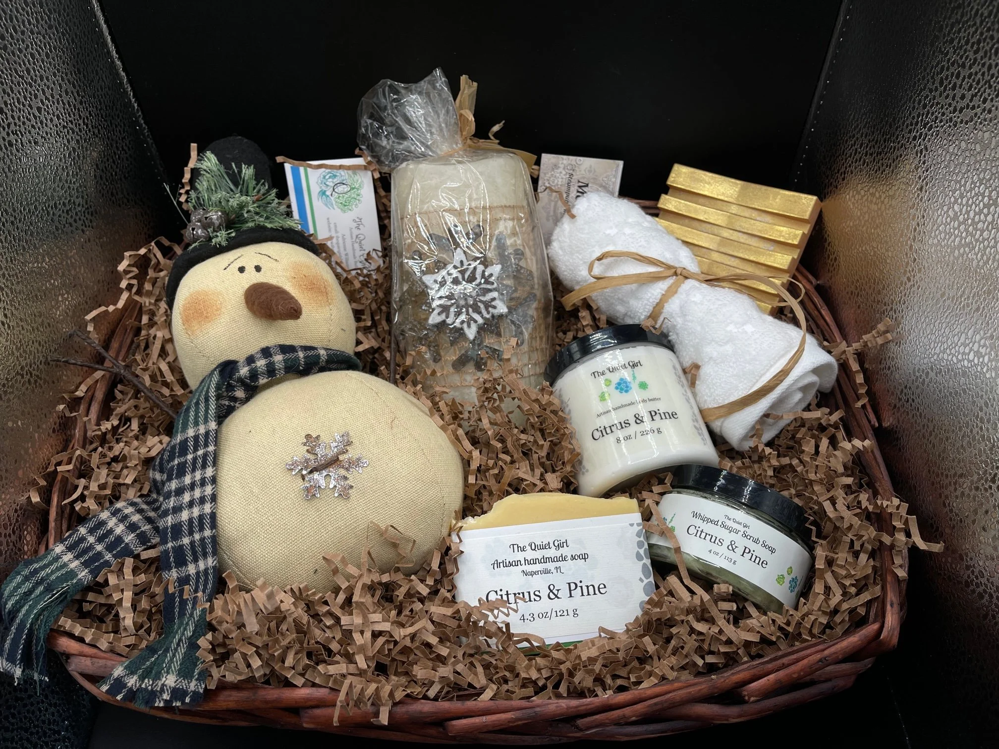 This gift basket is filled with winter goodness for anyone who wants to feel pampered. Cute snowman with a snowflake time candle (auto 6 hours on/18 hours off), Citrus & Pine Bar, Whipped Sugar Scrub soap, Body Butter, gold resin soap saver, and washcloth. All in a reusable wicker basket.